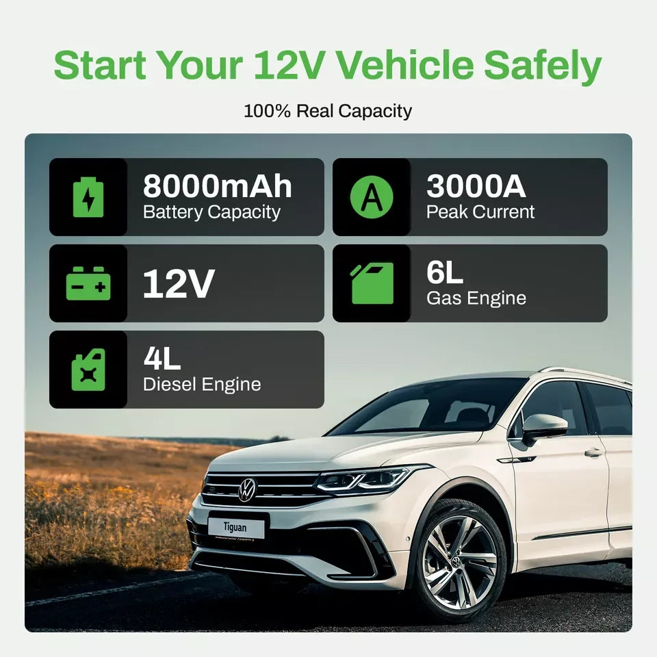 UP to 3000A PEAK CURRENT—Jump Starter Anytime, Anywhere
