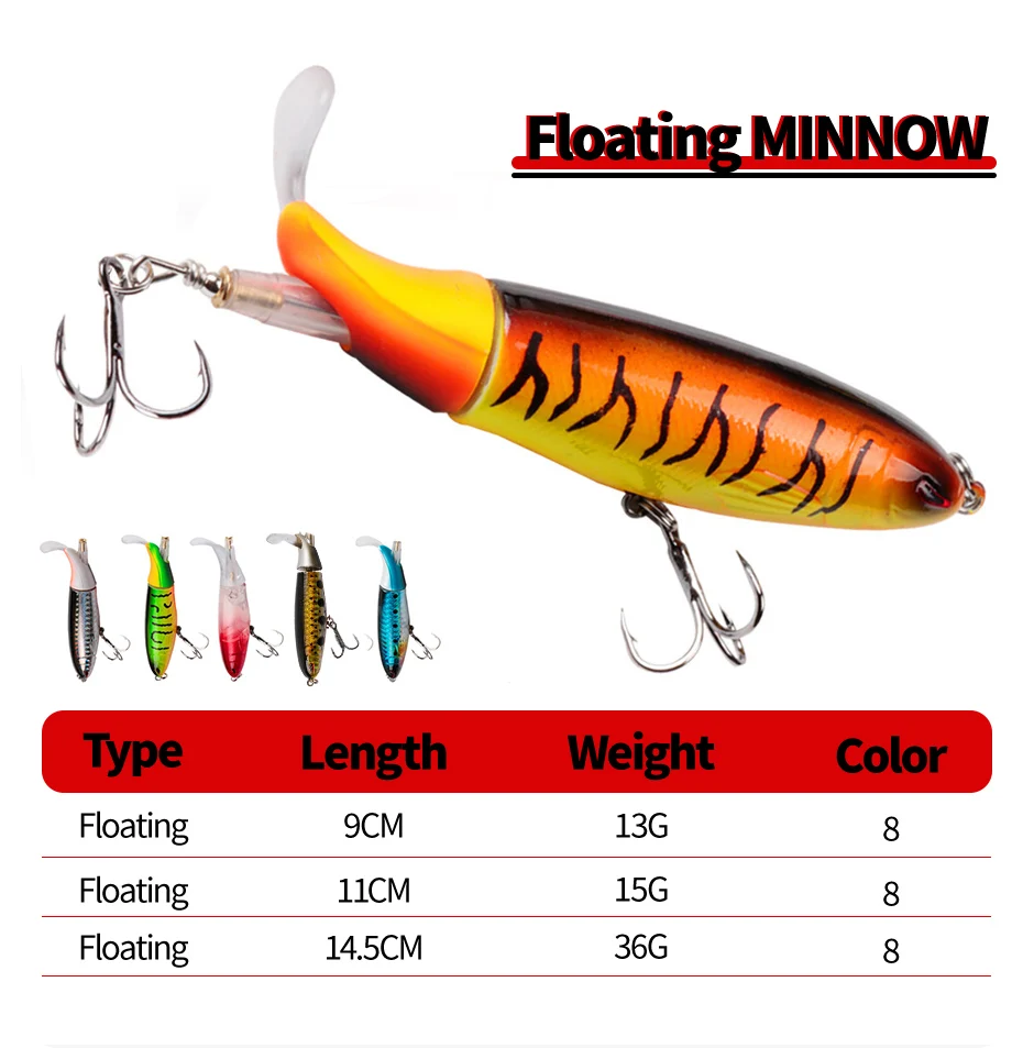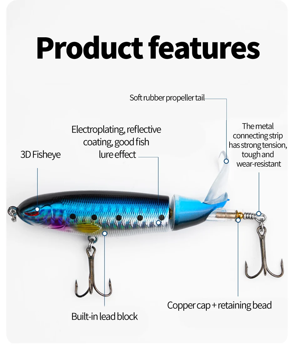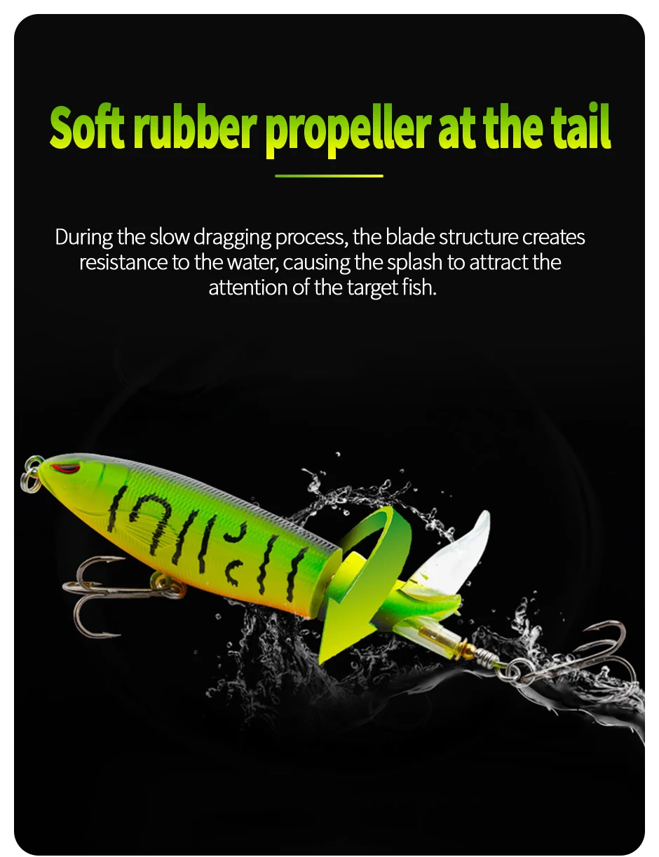• Topwater Lure :This Whopper Plopper Popper Propeller Lure is designed for topwater fishing, creating a splash and noise that attracts fish from deeper waters.