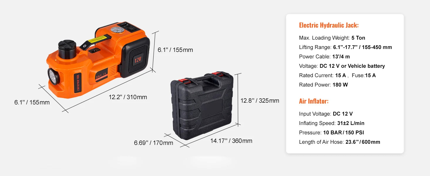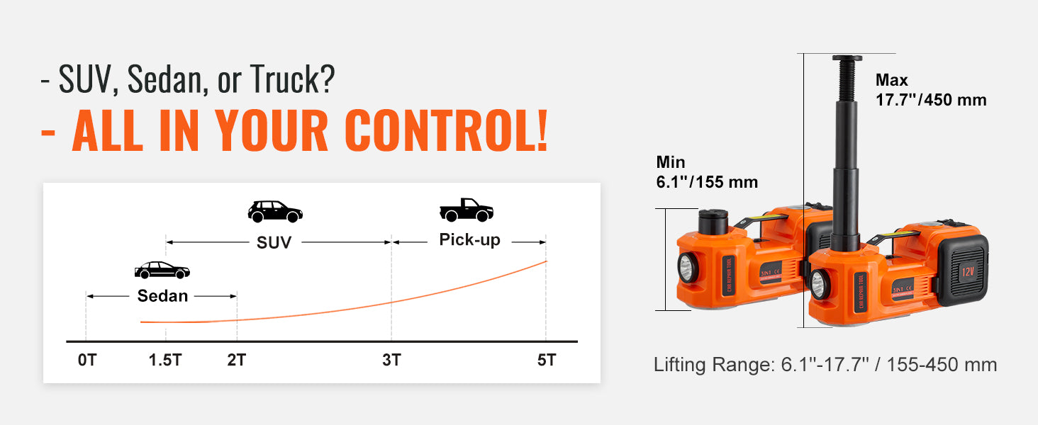 Powerful Electric Car Jack: Lifting capacity: 5.0 tons/11023 lbs. Lifting Range: 6.1''-17.7" / 155-450 mm. This electric car jack kit is a lifesaver during roadside emergencies and can be used for at-home garage repairs. It matches all autos, sedans, SUVs, trucks, or vehicles that suit its capacity.