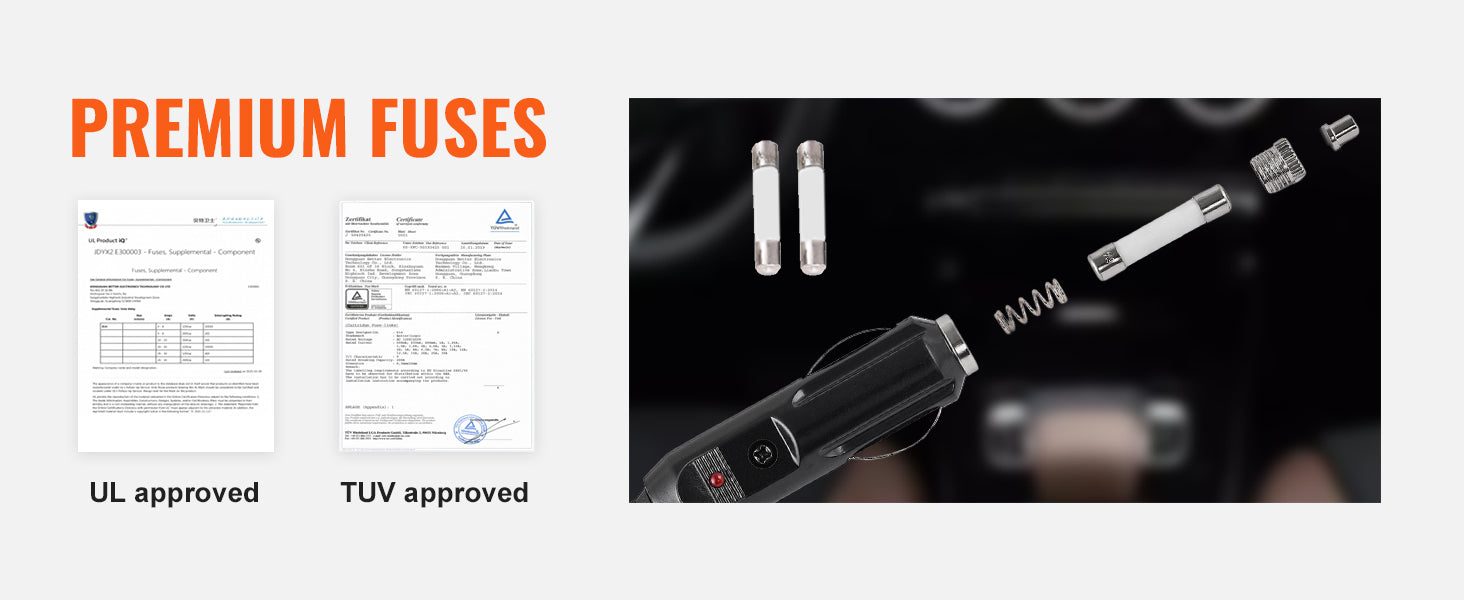 More Than 1 Way to Charge: The electric hydraulic jack for your vehicle can be powered by a 12V cigarette lighter or car battery and equipped with a long 13 feet power cord so you can place it by the front or rear tire without having to think twice. We also provide you with three spare fuses, and our fuses are TUV, and, so you can use them confidently!